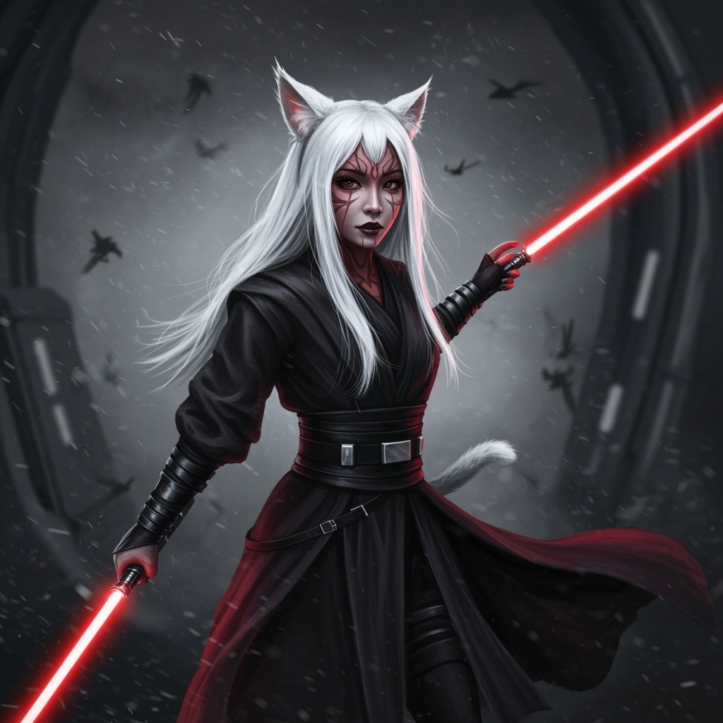 Asian girl with striking white hair and cat ears, portrayed as a Sith lord in a hyperdetailed, masterpiece 8k image. She is captured in a dynamic pose with an immersive, monochrome grayscale background, enhancing the depth of field. Emphasizing fine detail, the character exudes an aura of power and mystery, while subtle creative elements add uniqueness to the scene.