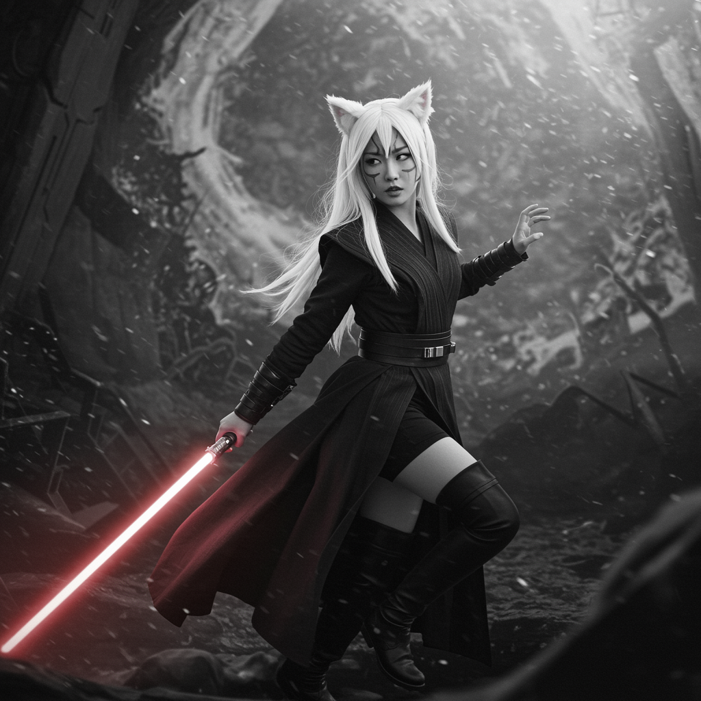 Asian girl with white hair and cat ears, embodying a Sith lord in a dynamic pose, surrounded by a hyperdetailed, immersive background. The scene is monochrome and grayscale, featuring a beautifully rendered depth of field, capturing a sense of power and mystery. The artistry is of a masterpiece level, boasting 8k resolution, while maintaining a focus on ideal anatomy and avoiding negative artistic elements to ensure a striking and visually compelling composition.