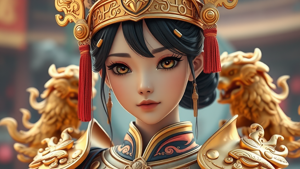 Asian paladin girl with a flawlessly crafted face, adorned in resplendent gold armor with intricate lion motifs, showcasing exquisite detail and photorealistic artistry. The scene embraces the grandeur of a cinematographic 8k shot with a soft, cinematic blur. Her appearance blends the vibrant stylizations of anime with the vividness of a high-quality 3D render, capturing an enchanting fusion of realism and cartoon elements. She stands poised and determined, exuding a sense of noble strength and elegance.