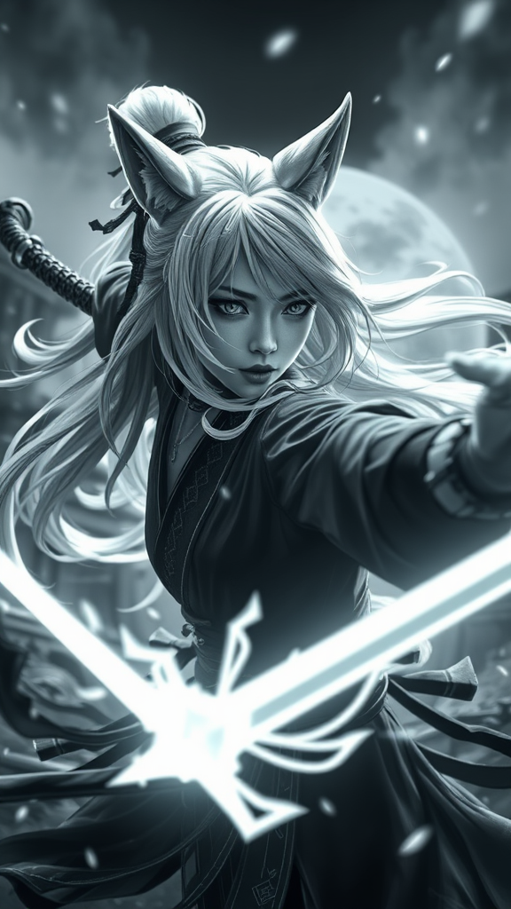 Asian Sith lord character with white hair and cat ears, depicted in a hyperdetailed, dynamic pose that showcases her power. The scene is a masterpiece in 8k resolution with an immersive background that exhibits depth of field. The visual theme is monochrome and grayscale, casting an intense and moody atmosphere. The character's appearance and the overall image quality are enhanced by using advanced artistic techniques to avoid negative styles and maintain an exceptional artistic standard.