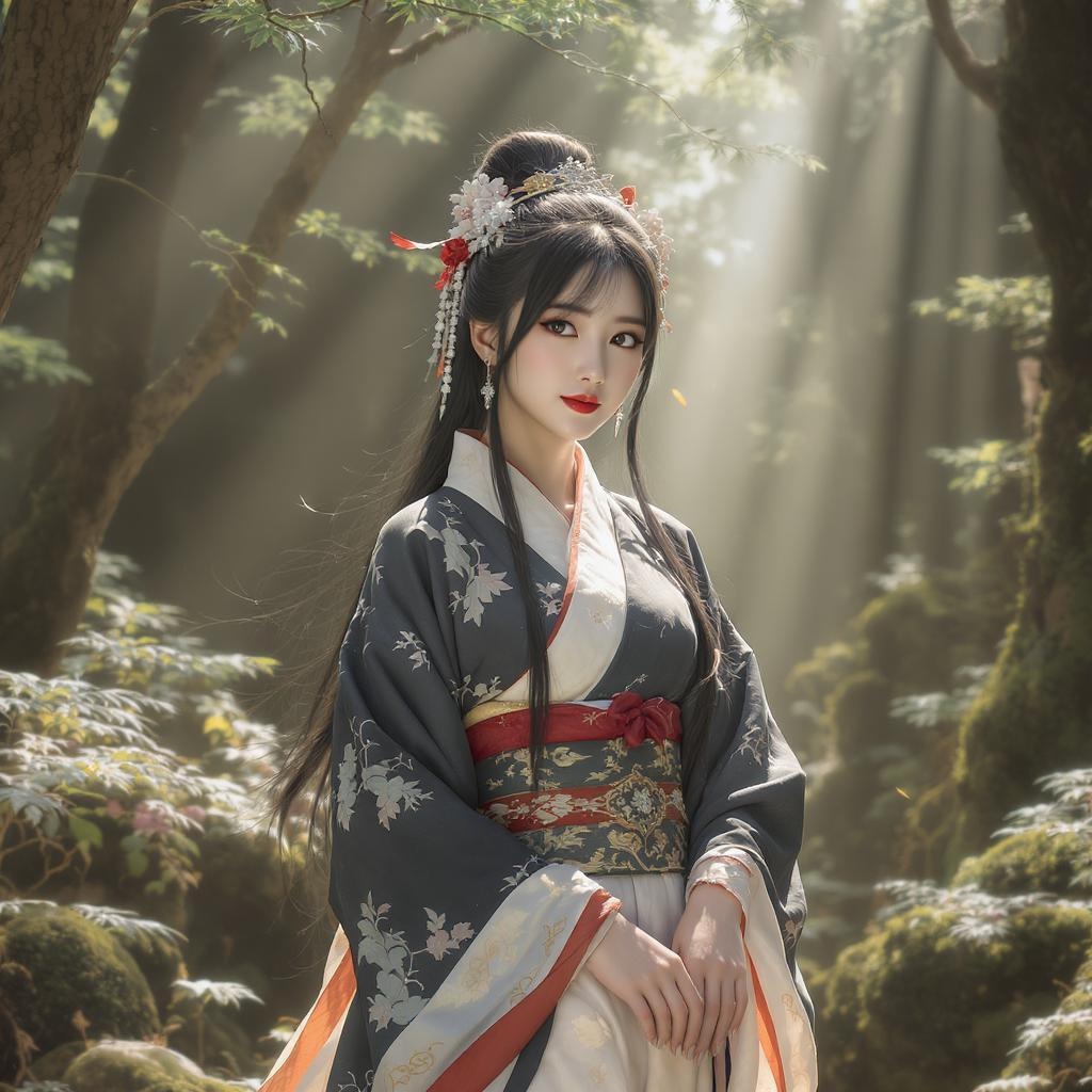 A young Asian woman gracefully stands in a serene forest, adorned in an elegant kimono that blends harmoniously with the natural surroundings. The scene is rendered with the stunning realism and detail characteristic of Unreal Engine 5, capturing the romantic essence of ancient illustrations. Her attire reflects the timeless elegance of the Western Zhou Dynasty, featuring intricate patterns in hues of dark white and light red. The image is in sharp focus, highlighting the delicate features of the woman and the lush texture of the forest. Bathed in a solarizing light, the setting takes on an ethereal quality, enhancing the detailed character rendering and creating a captivating fusion of tradition and immersive artistry.