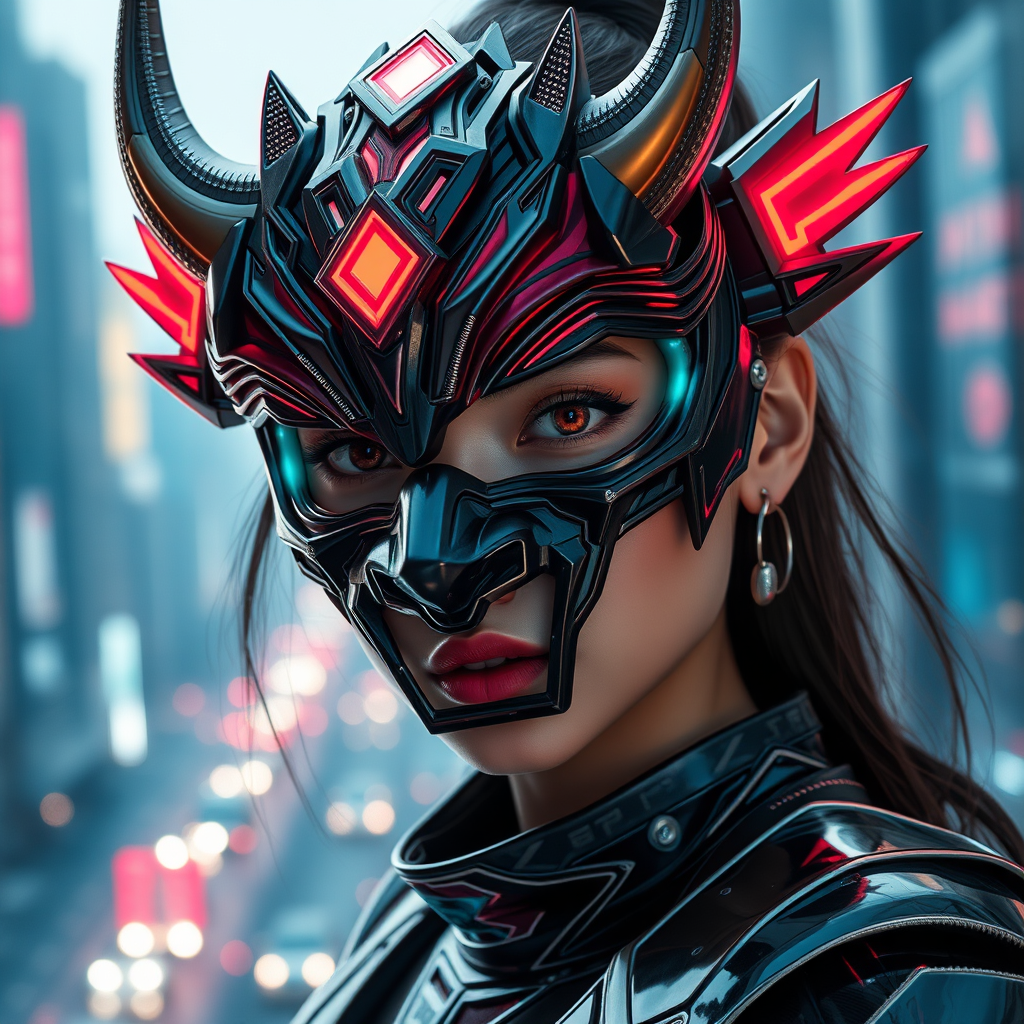 View this AI-generated image featuring a young asian woman with a sleek cyberpunk aesthetic dons an intricately designed oni mask her eyes gleaming with intensity behind the ornate angular features of the mask the scene captures a stunning contrast between traditional mythology and futuristic elemen
