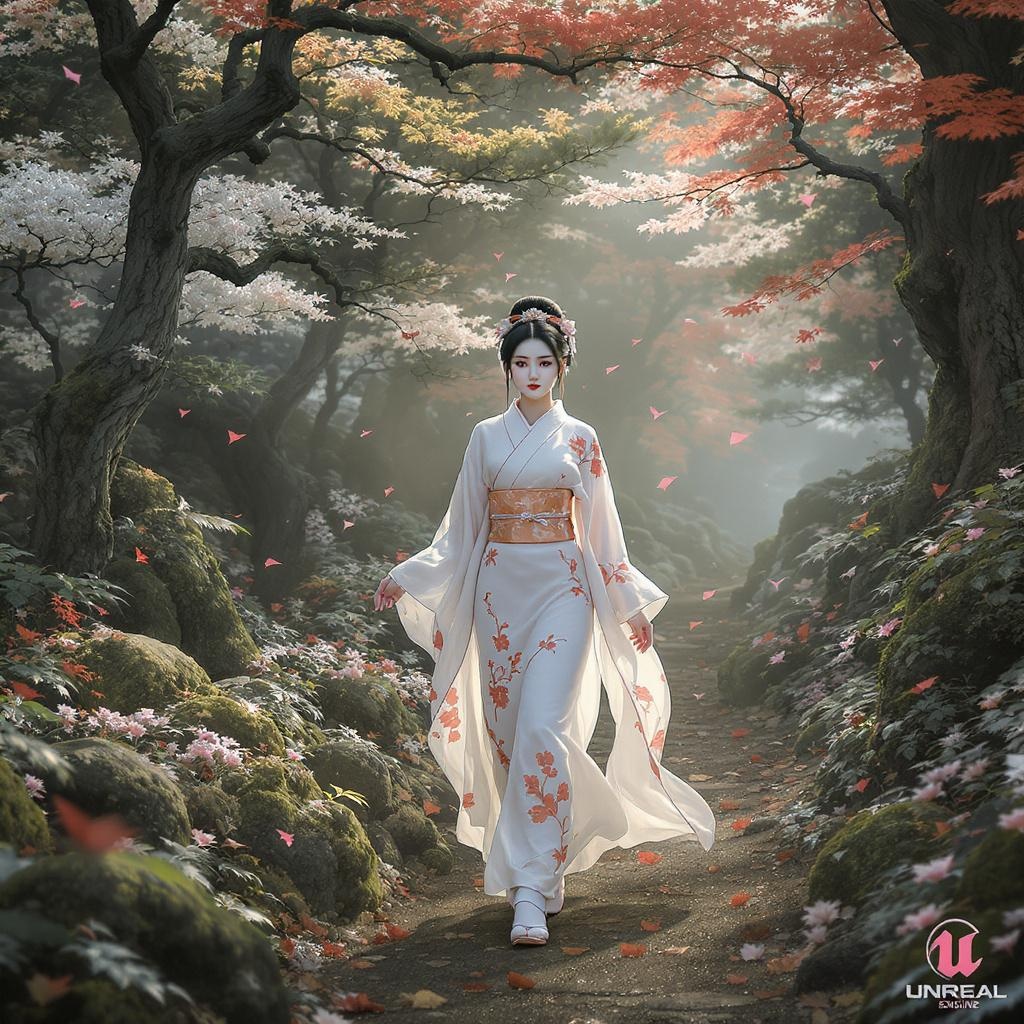 View this AI-generated image featuring a young asian woman gracefully wanders through a lush forest adorned in an elegant kimono reminiscent of the western zhou dynasty the setting is depicted in the style of unreal engine 5 blending romantic illustration elements with a harmonious palette of dark w