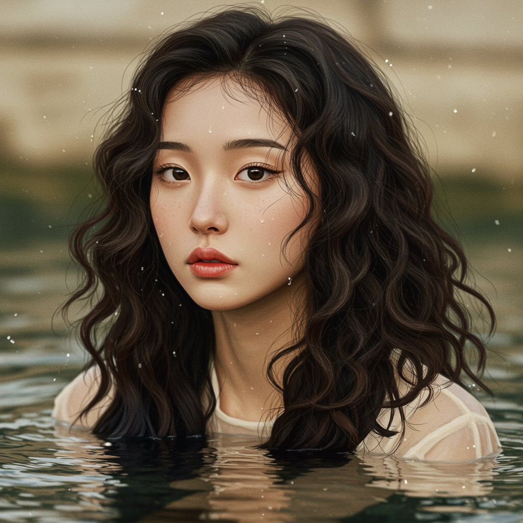 Asian woman with curled hair, captured in hyper-realistic style, her distinct facial features elegantly defined. The essence of oshare kei and mori kei influences her look, complemented by the subtle hues of dark beige. The scene is enriched with a hyper-realistic depiction of water, embodying the aesthetics that evoke the charm of hallyu culture. The composition, reminiscent of the Samyang AF 14mm f/2.8 RF lens, highlights her natural beauty, set against an imagined background that balances modernity with classic allure.