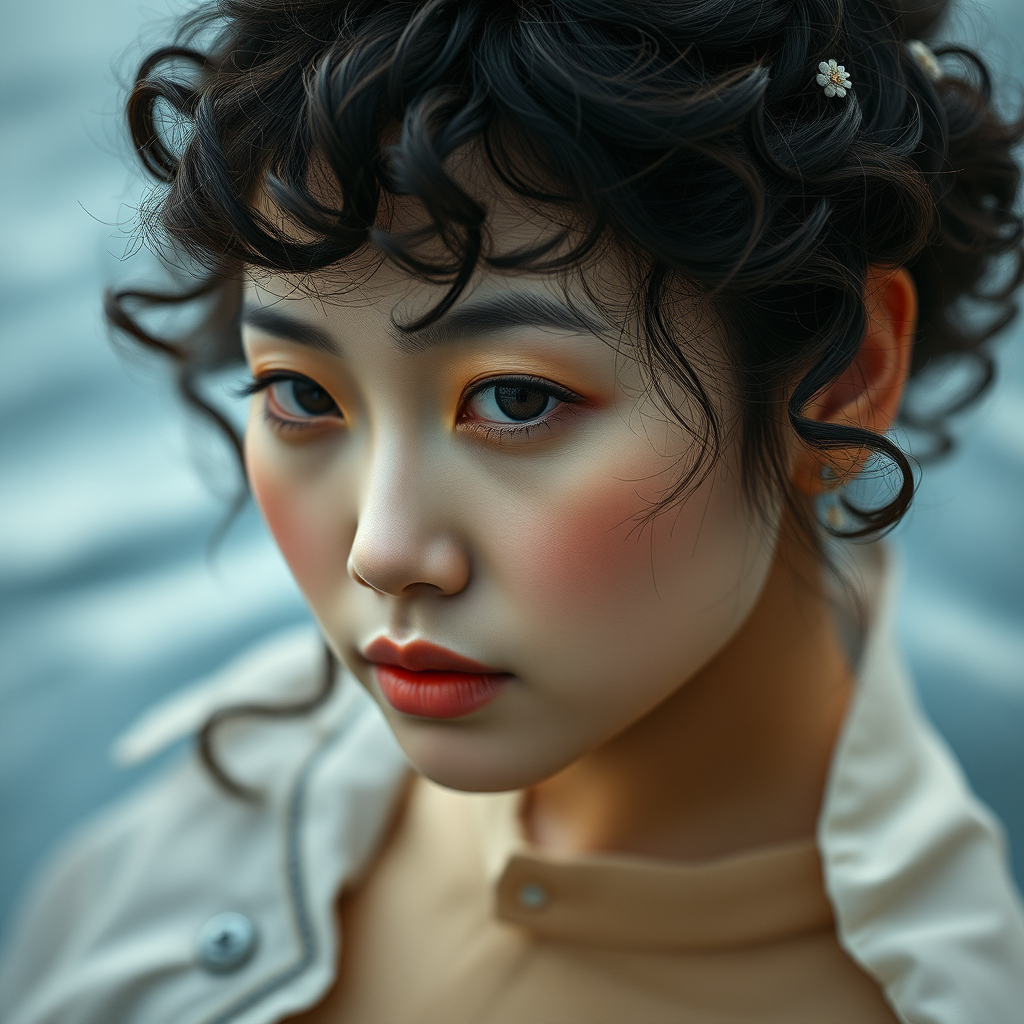 Asian woman with curled hair, captured in the style of samyang af 14mm f/2.8 rf lens, featuring oshare kei aesthetic with dark beige tones, hyper-realistic depiction of water, and distinct facial features. Infused with mori kei elements and hallyu influences, set against an aspect ratio of 73:110, with a high level of stylization at 750, version 6.