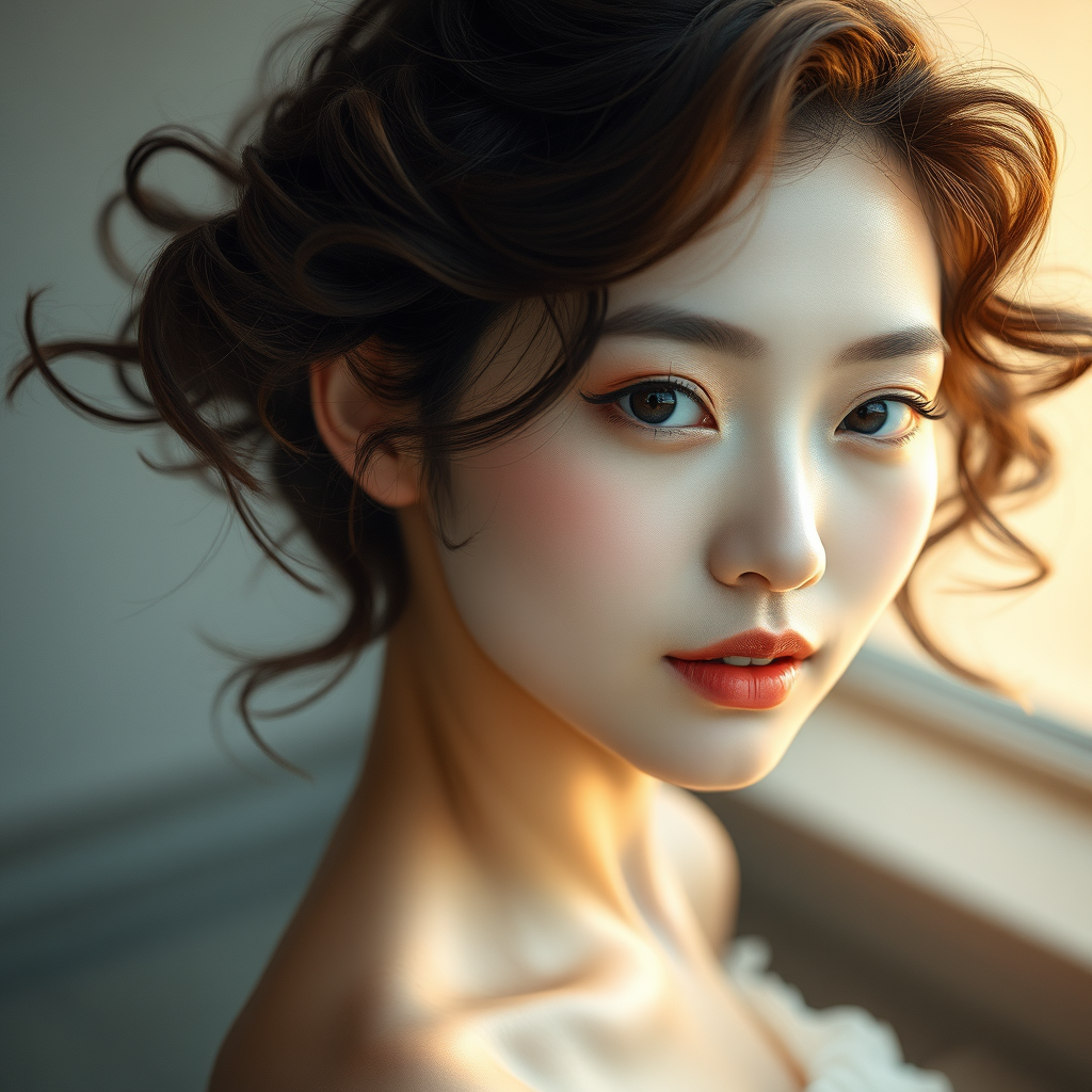 Asian woman with elegant curled hair, styled with influences of samyang af 14mm f/2.8 rf, embodying oshare kei with a palette of muted beige hues, captured with hyper-realistic water effects, showcasing distinct and captivating facial features; the look is infused with mori kei elements and a touch of hallyu appeal, proportioned within a 73:110 aspect ratio, stylized to a level of 750, version 6.