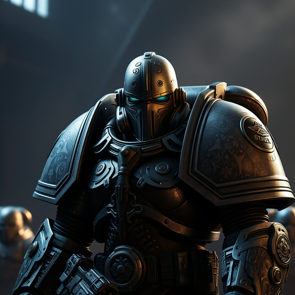 Astartes soldier wearing intricately detailed power armor, set in the grim Warhammer 40k universe, enveloped in a palette of dark tones and illuminated with dramatic, cinematic lighting; the scene is rendered in hyper-realistic detail, capturing the essence of futuristic warfare as shadows play across the armor's surface, highlighting its ornate engravings and battle-worn texture.