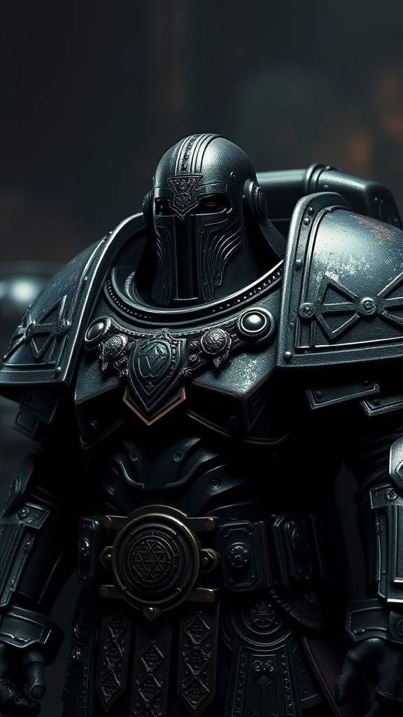 Astartes warrior clad in intricately detailed armor, set in the grim universe of Warhammer 40k, bathed in moody, cinematic lighting with dark, atmospheric tones, hyper-realistic textures and precise craftsmanship featuring subtle alterations to classic design elements.