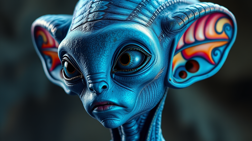 Astonishing blue extraterrestrial with a single large eye and prominent ears, featuring an array of vibrant and varied colors. The character rests perfectly centered in the portrait, boasting a design that emphasizes extreme detail and symmetry. The face and skin showcase intricate textures and patterns, illuminated by cinematic lighting that enhances the spirit of epic sci-fi and fantasy. The hyper-realistic, ultra-detailed depiction is captured in a digital painting that appears as a masterpiece of digital art, demonstrating sharp focus and detail rendered in 8k resolution. The portrayal stands out in the mdjrny-v4 style side view, ensuring a compelling and captivating visual experience.