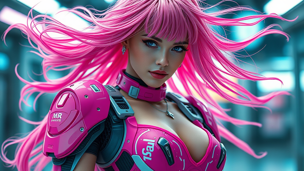 astonishing cyborg woman in vibrant pink combat armor, flowing pink hair, in a cyberpunk setting, elegant lingerie, futuristic high-tech design, sci-fi allure, playfully intriguing, captivating, facing the viewer, an artistic portrayal, photo-realistic quality, with intricate skin details, 8k resolution, meticulously crafted, full-body composition, vivid colors, soft diffused lighting, shallow depth providing focus, hyper-realistic, cinematic CGI style, includes a touch of creative glitch effects, emphasizing uniqueness, maintaining core aesthetic with slightly distorted elements for artistic effect, ensuring visual depth without compromising image integrity.