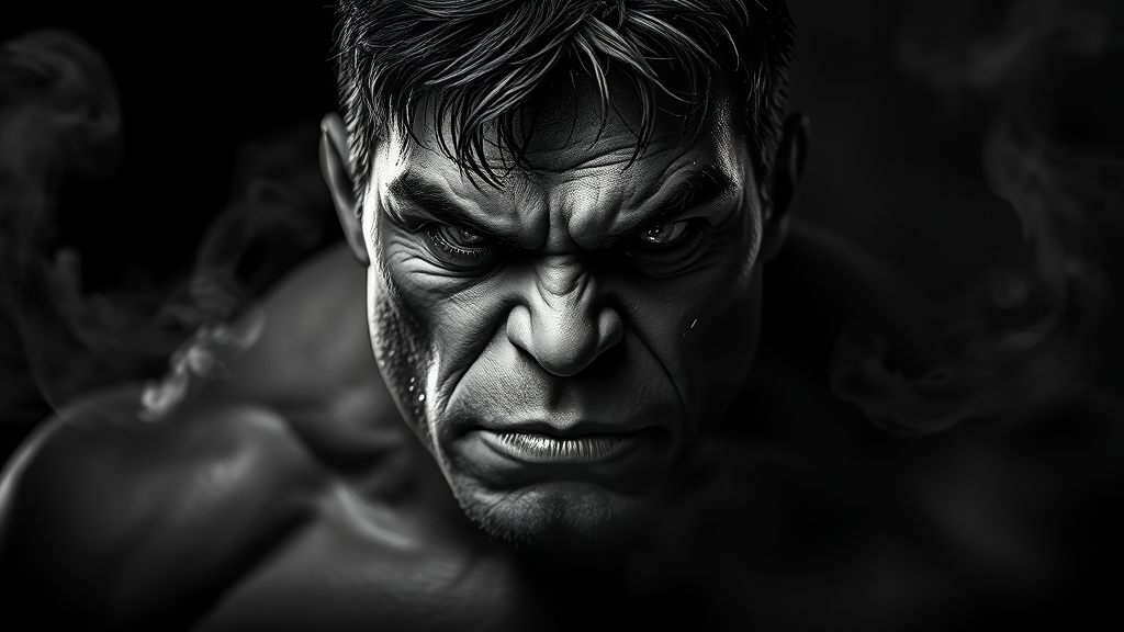 Astonishing Hulk superhero captured by Lee Jeffries, intense and expressive eyes, enveloped in a dark, moody background, featuring a harmoniously proportionate physique, photorealistic attire with intricate details, high contrast imagery, HD, HDR, with cutting-edge ray tracing and lifelike subsurface scattering. A monochromatic black and white composition with ethereal smoke effects conjured by Unreal Engine 5, enhanced by Octane Render and V-Ray, showcasing exceptional detailing, ultra-resolution, and immersive volumetric lighting. Shot with a Hasselblad X1D-50c and an XCD 120mm f/3.5 lens, set at ISO 200, ensuring sharp, full-body focus and captured in stunning 8K resolution --ar 9:18 --v 5 --s 250.