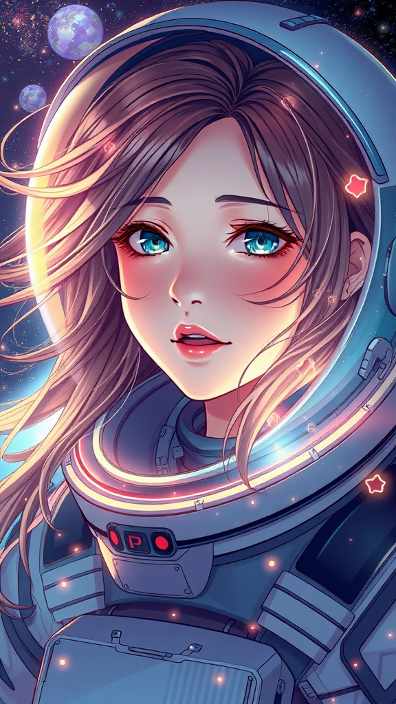 Astounding full-length portrait of a young female astronaut, intricately detailed and beautifully crafted in vibrant fanart. She has a stunningly gorgeous face with ethereal, magical glowing trails swirling around her, accompanied by delicate light dust particles. The visual is rendered in rich, full-color manga style with an anime key visual flair. Her hair, flowing and exquisite, adds an extra layer of dynamism, enhancing the overall captivating and otherworldly theme.