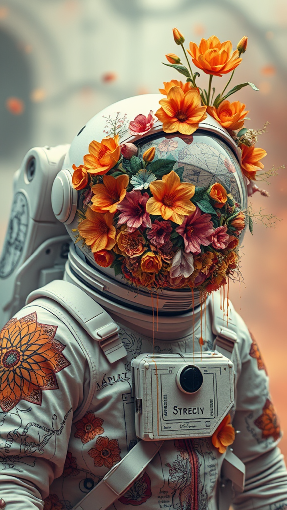 Astronaut clad in a suit detailed with intricate designs, helmet bursting with an explosion of vibrant, intricate flowers in coquelicot hues, layered with elements resembling precise anatomical drawings, subtle drips of paint cascading over the composition, creating a surreal blend of color and form, set against a dreamy, ethereal background with a softly blurred depth of field, capturing a vertical aspect ratio in visionary fashion.