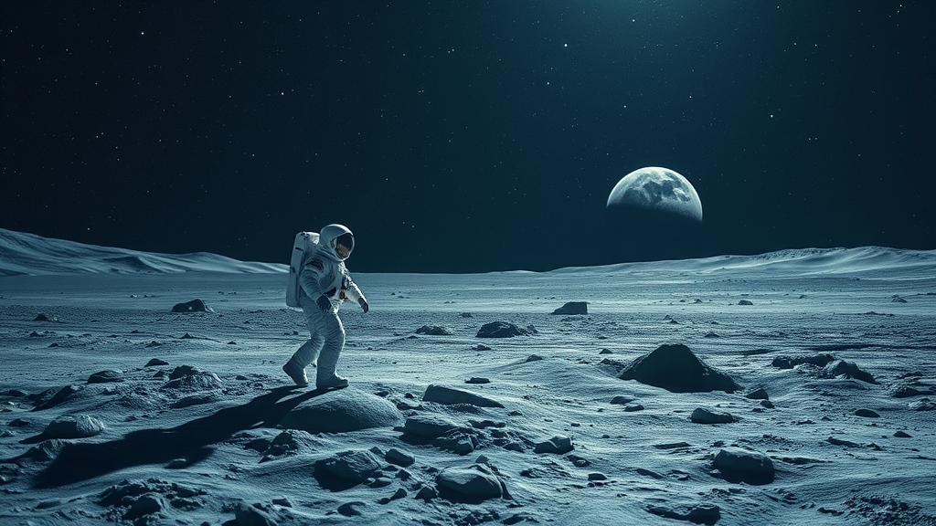 Astronaut exploring a barren lunar landscape under a starry sky, enveloped in a serene cold color palette featuring muted blues and soft grays, highly detailed textures and sharp focus, shadows emphasize the desolate beauty of the moon's surface, distant earth gently fading into the background.
