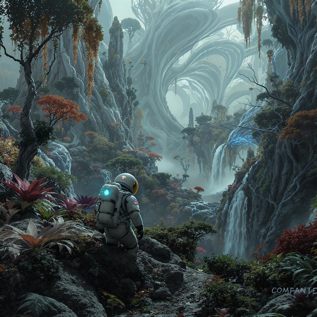 Astronaut exploring a lush alien landscape, a masterpiece of sci-fi atmosphere, meticulously detailed with vivid clarity, capturing intricate natural elements, lush vegetation and surreal alien flora, in stunning 4k resolution, embracing a trending artstation style, enhanced with creative lighting and dynamic shadows, evoking a sense of wonder and adventure.