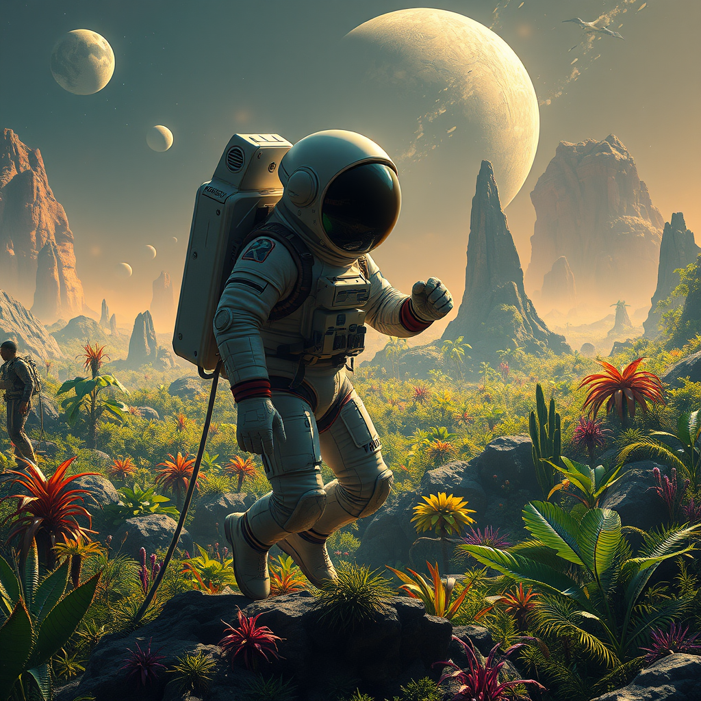 Astronaut exploring a lush, alien landscape on a vibrant, verdant planet, a stunning masterpiece in sci-fi atmospheric style, featuring a breathtaking, intricate design with sharp focus and highly detailed elements, captured in 4k resolution, trending on artstation, enriched with imaginative nuances and subtle enhancements to bring the otherworldly environment to life.