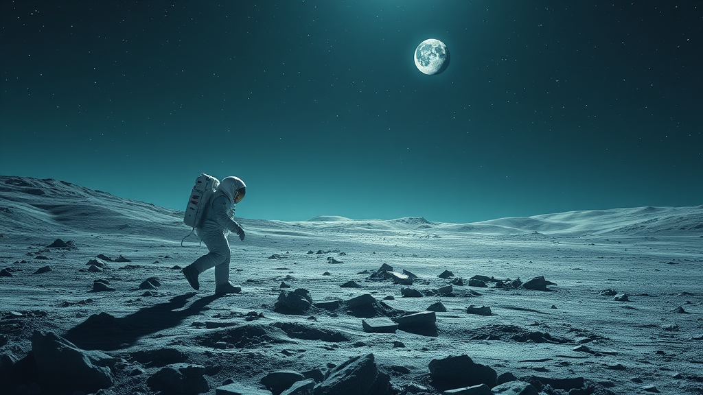 Astronaut exploring the lunar surface under a vast, starry sky, illuminated by the soft glow of Earthlight. The scene is rendered in a cool color palette featuring shades of blue, gray, and silver with subtle hints of teal. The muted and ethereal tones blend harmoniously, emphasizing the tranquil yet mysterious lunar landscape. Detailed textures capture the rugged terrain, the astronaut's suit, and the intricate machinery of their equipment. The sharp focus showcases the serene isolation of the moon, inviting contemplation and wonder in this otherworldly setting.