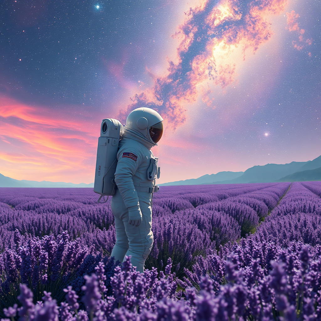 Astronaut gazing upon a vast lavender-hued meadow, with a breathtaking celestial landscape painting the sky in vivid colors, a masterpiece of sci-fi atmospheric photography; the scene is rendered in stunning detail, 4k resolution, hyperrealistic, with enhancements to highlight the surreal beauty and intricate textures of the terrain and sky.