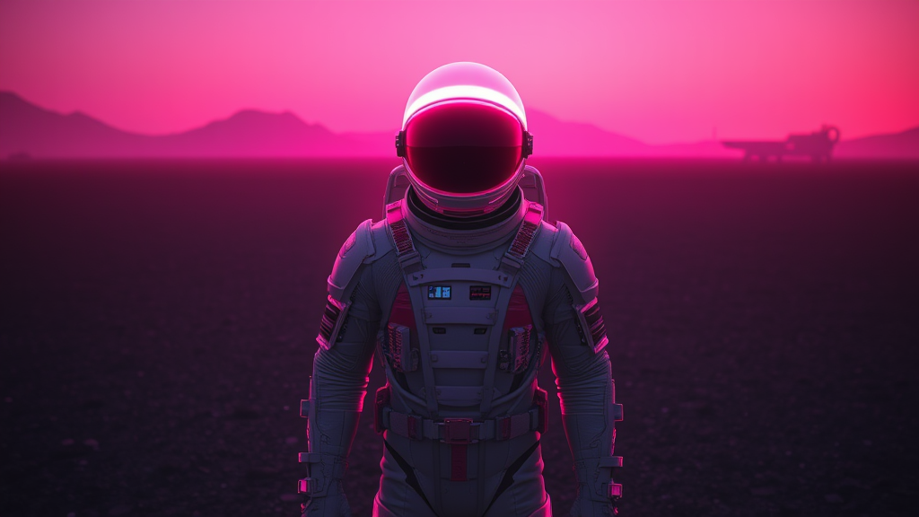 Astronaut male figure stands in a vast, surreal landscape evocative of Death Stranding, wearing a highly detailed space suit with an anatomically correct design. The helmet emits a soft pink glow, casting a vibrant hue across the scene. Surrounding him is an expansive field bathed in dynamic, cinematic lighting creating dark, dramatic shadows. The hyper-detailed environment and character are rendered with unrealistic Engine 5 detail, utilizing high flare and ray-tracing effects to enhance the immersive quality. The composition is presented in a 9:16 aspect ratio, emphasizing the majestic verticality of the scene. Subtle creative elements, such as ethereal mist and distant futuristic structures, add depth and intrigue to the atmospheric setting.