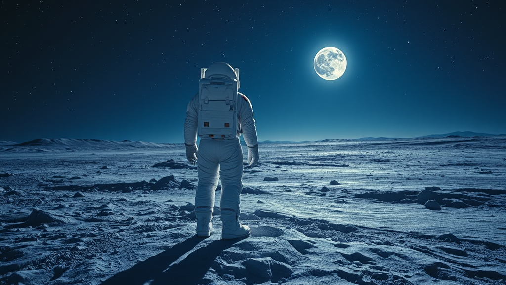 Astronaut standing on the moon under a starry sky, illuminated by the Earth’s glow, cold shades of blue and lavender dominate the scene, muted colors create a serene atmosphere, intricate details on the astronaut's suit and lunar surface, sharp focus highlights the textures and subtle reflections, distant planets visible in the clear sky.