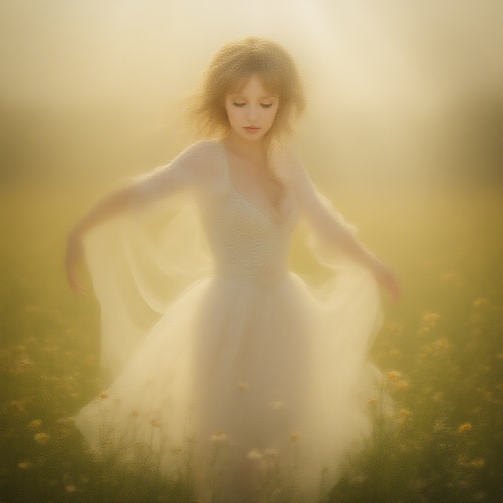 Asuka Langley gracefully dancing in a sunlit field of flowers, wearing an elegant dress. Her face features exquisite detail and expression, amidst shafts of divine light filtering through the scene. Despite the beauty, there are subtle imperfections: faint image artifacts and slight distortions hinting at a surreal quality, adding an intriguing layer to the artwork's dreamy atmosphere.
