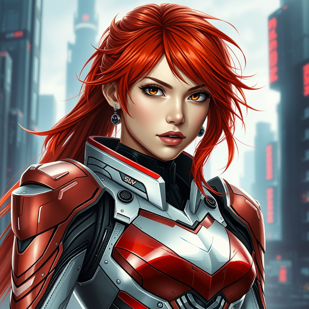 Asuka Langley in stunning sci-fi armor, showcasing intricate details and sleek design, set against a futuristic cityscape. The portrait captures her fierce determination and elegance, emphasizing photorealistic textures and vibrant colors that highlight her iconic red hair and intense gaze, reflecting both strength and beauty in a harmonious blend.