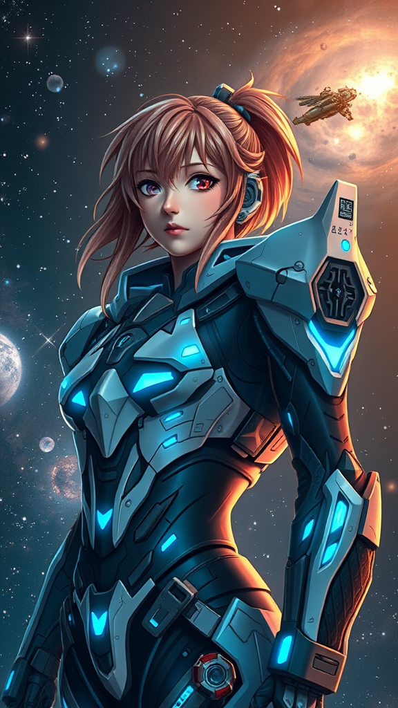 Asuka Langley Soryu in Orbital Ascension, a stunning photorealistic portrait of the iconic mecha pilot wearing advanced, high-tech armor adorned with intricate circuit patterns and glowing blue accents, set against a striking backdrop of stars and nebulas, composition 1:2.