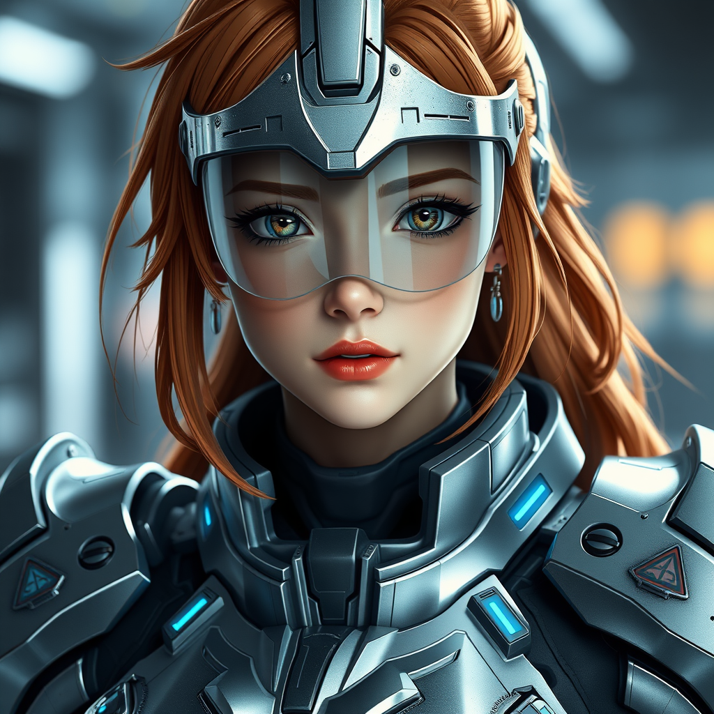 Asuka Langley Soryu in superior officer uniform with closed face shield, photorealistic portrait, beautiful facial features, stunning silver scifi armor, futuristic hardsuit with sharp lines, glowing blue accents, gleaming metallic texture, atmospheric lighting, 1:2 aspect ratio, medium to high complexity, 750x with 2x quality, 20 iterations.
