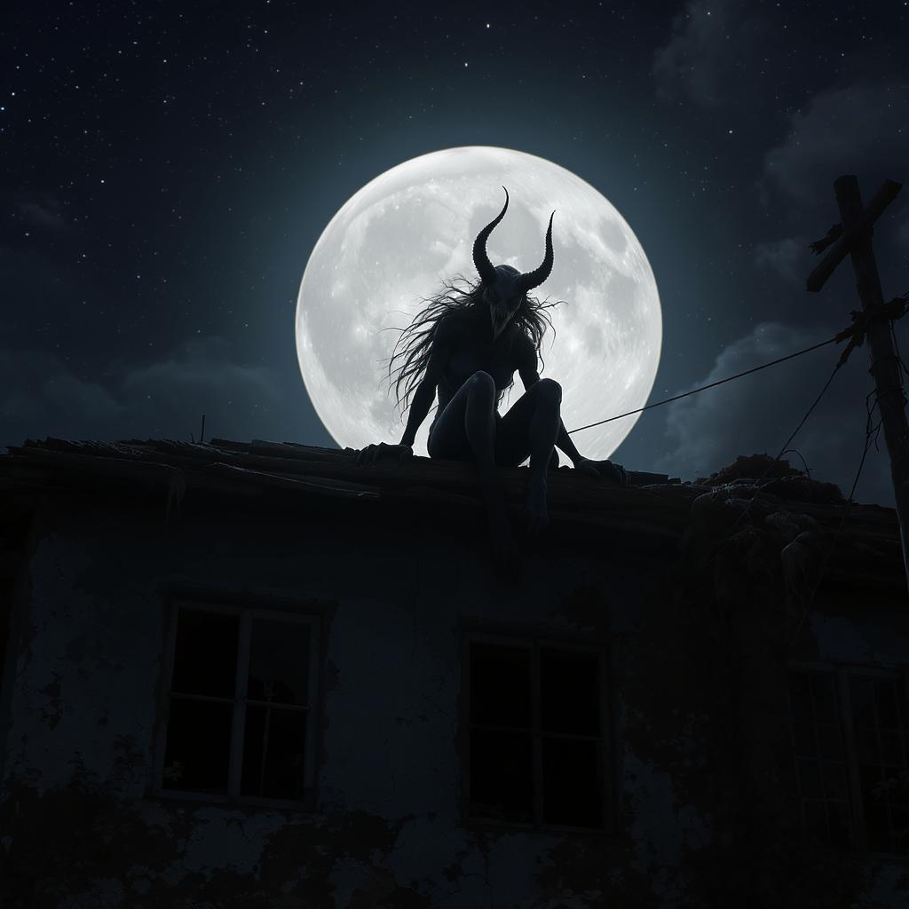 Aswang, a terrifying female creature with elongated fangs, perched menacingly on the roof of a dilapidated house, silhouetted against a luminous full moon. The scene is dark and macabre, capturing the essence of horror and the haunting folklore of the Philippines. Rendered in hyperrealism and photorealistic detail, the setting comes to life in stunning 8k resolution. Using the powerful Unreal Engine for a lifelike 3D render, the camera angle is dramatic with an aspect ratio of 9:16. Employing an expressive style, the image conveys a haunting atmosphere that lingers with unsettling beauty, evoking a chilling sense of the supernatural.