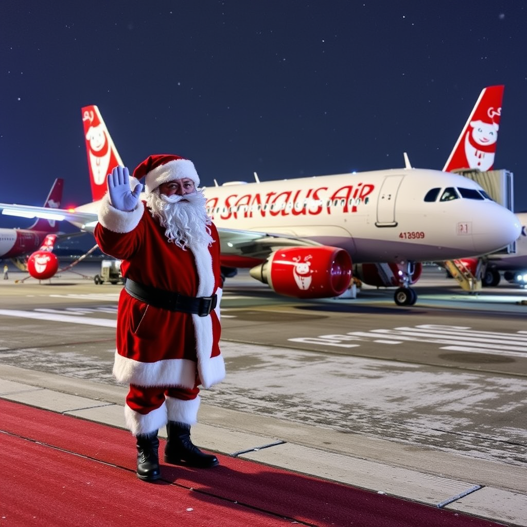 At the airport, a festive Airbus A320 from Santa Claus Air gleams with special Christmas decorations, featuring twinkling fairy lights and cheerful reindeer motifs. Nearby, Santa Claus himself stands on the tarmac, greeting passengers with a jolly wave, as snow gently falls around him, adding to the magical holiday atmosphere.