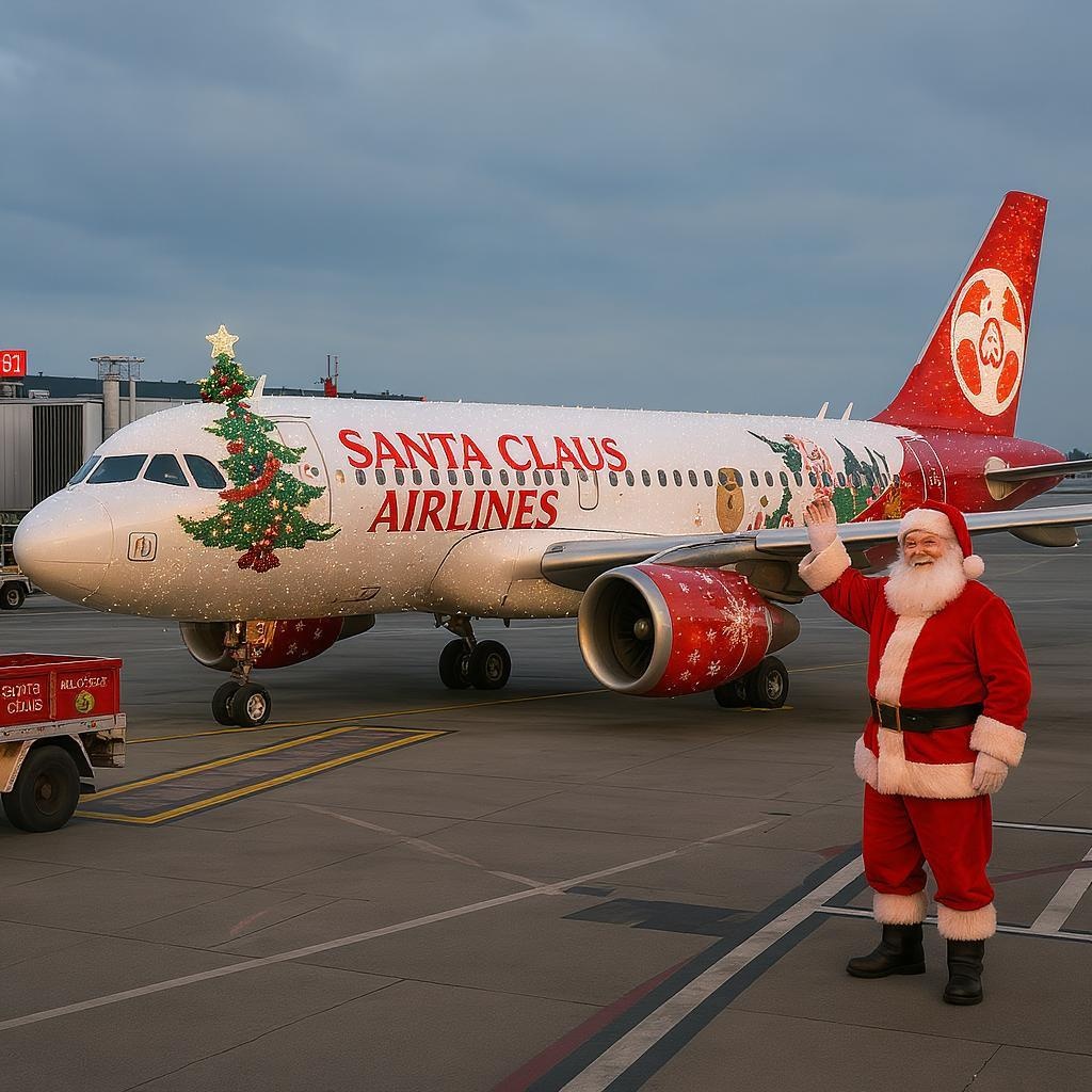 At the airport, a uniquely festive Airbus A320 from Santa Claus Airlines sparkles with its special Christmas decorations, featuring twinkling lights and vibrant holiday imagery. Nearby, Santa Claus stands jovially on the tarmac, greeting passengers with his iconic smile and waving warmly as holiday cheer fills the air.