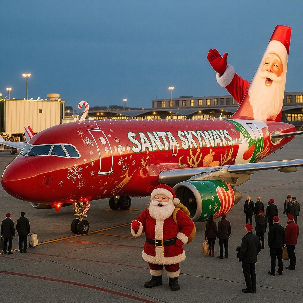 At the airport, an Airbus A320 airliner, belonging to the festive-themed Santa Skyways, showcases its special Christmas decorations. The plane is adorned with vibrant red and green livery, snowflake patterns, and twinkling fairy lights along the wings. A gigantic image of Santa Claus, jovial and waving, is painted across the tail, while candy canes and reindeer prance along the fuselage. On the tarmac, among the bustling ground crew, a life-sized Santa Claus figure stands proudly, greeting passengers with a hearty laugh and a sack full of holiday cheer, embodying the magic of the season.