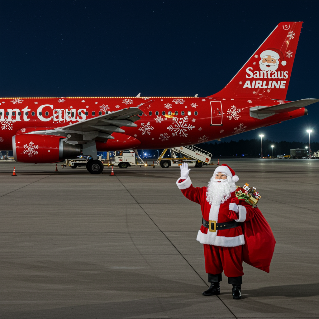 At the airport, an Airbus A320 airliner of the Santa Claus Airline is displayed in festive glory, adorned with vibrant Christmas decorations. The aircraft is painted in a rich, holly red with shimmering snowflakes cascading along its fuselage and twinkling fairy lights outlining its windows. On the tail fin, a larger-than-life image of Santa Claus himself, with rosy cheeks and a jolly smile, stands out against a backdrop of a starry winter night. Standing proudly on the ground near the plane, Santa is dressed in his iconic red suit, holding a sack full of gifts, waving to delighted travelers who are capturing the holiday spirit with every click of their cameras. The scene is alive with festive energy, as the magic of Christmas takes flight.