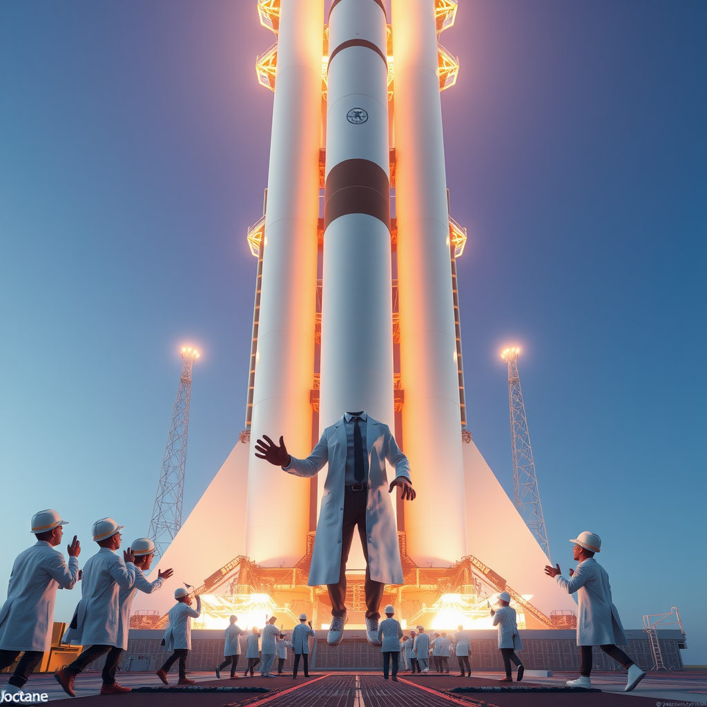 At the base of the towering rocket, the launchpad buzzes with activity. Engineers and technicians, clad in white lab coats and sturdy hard hats, dart around, conducting final checks and fine-tuning the rocket's complex systems. Sparks cascade from welding torches, accompanied by a symphony of chatter and the hum of machinery. cgi, 3d, doll, octane, render, lowres, text, error, cropped, worst quality, low quality, jpeg artifacts, unattractive, duplicate, morbid, distorted, out of frame, extra fingers, mutated hands, poorly crafted hands, poorly rendered face, mutation, deformed, unfocused, dehydrated, flawed anatomy, disproportionate, extra limbs, cloned face, disfigured, odd proportions, malformed limbs, missing arms, missing legs, extra arms, extra legs, fused fingers, too many fingers, elongated neck.
