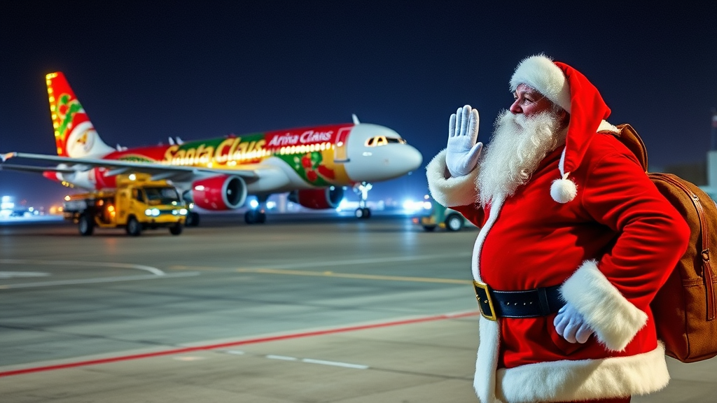 At the bustling airport, a festive spectacle awaited travelers as the Santa Claus Airline's Airbus A320 glided down the runway, adorned in a dazzling Christmas motif of red, green, and gold, twinkling lights accentuating its merry design. Nearby, Santa himself stood on the tarmac, waving cheerfully in his iconic red suit, spreading holiday cheer to passengers and airport staff, his laughter echoing with the joy of the season.