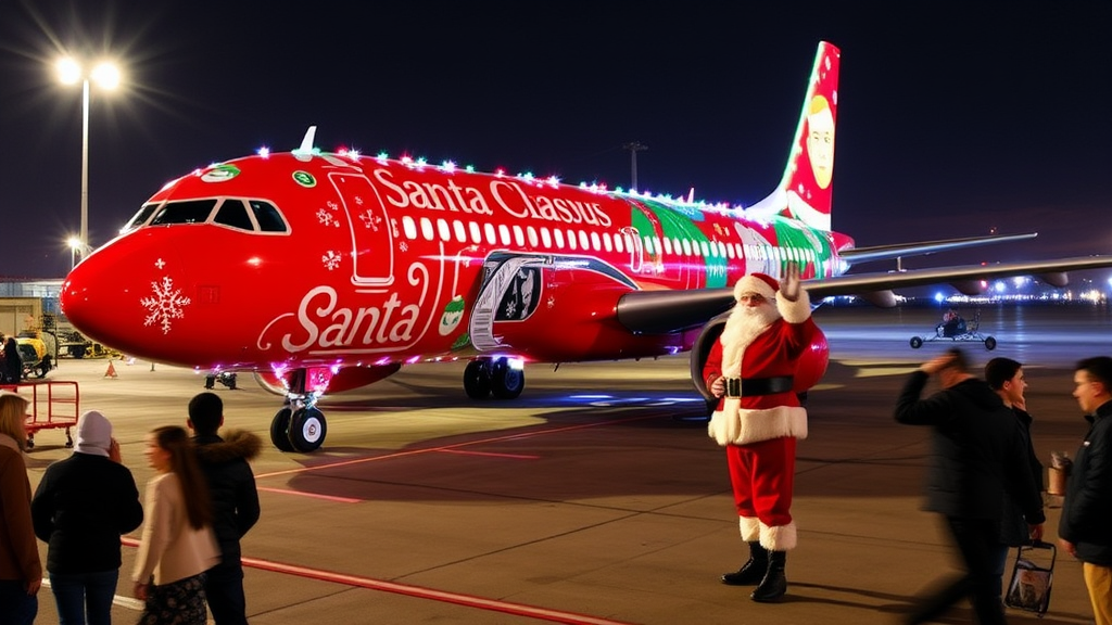 At the bustling airport, the Santa Claus Airline proudly showcased its Airbus A320 airliner adorned in vibrant Christmas decorations. The aircraft gleamed with festive cheer, featuring a dazzling array of twinkling lights and holiday-themed artwork painted along its fuselage. Nearby, Santa Claus himself stood on the tarmac, waving joyfully to the excited onlookers gathered to catch a glimpse of this spectacular holiday spectacle, the spirit of Christmas truly taking flight.