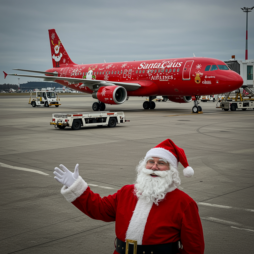 At the bustling airport, the Santa Claus Airlines Airbus A320 proudly displays its festive Christmas decorations, with a vibrant red and green livery adorned with twinkling lights, snowflakes, and playful reindeer motifs. On the tarmac below, Santa Claus himself stands jovially, dressed in his iconic red suit, greeting passengers with a warm smile and a merry wave as he oversees the magical holiday preparations for the special flight.