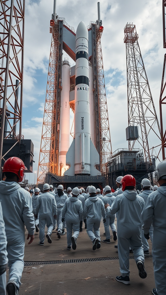 At the heart of the rocket launch site, a whirlwind of activity unfolds. Engineers and technicians, clad in sleek white coveralls and protective helmets, hustle around, executing final checks and fine-tuning the rocket's sophisticated systems. The air is alive with the hiss of welding equipment and the vibrant hum of machinery, interspersed with the energetic buzz of conversations.