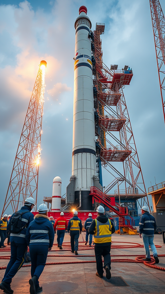 At the rocket's base, the bustling launchpad is alive with activity. Engineers and technicians clad in protective gear maneuver around, executing final checks and fine-tuning the rocket's complex systems. Welding torches emit bright sparks, and the air buzzes with the sounds of lively chatter and machinery at work.