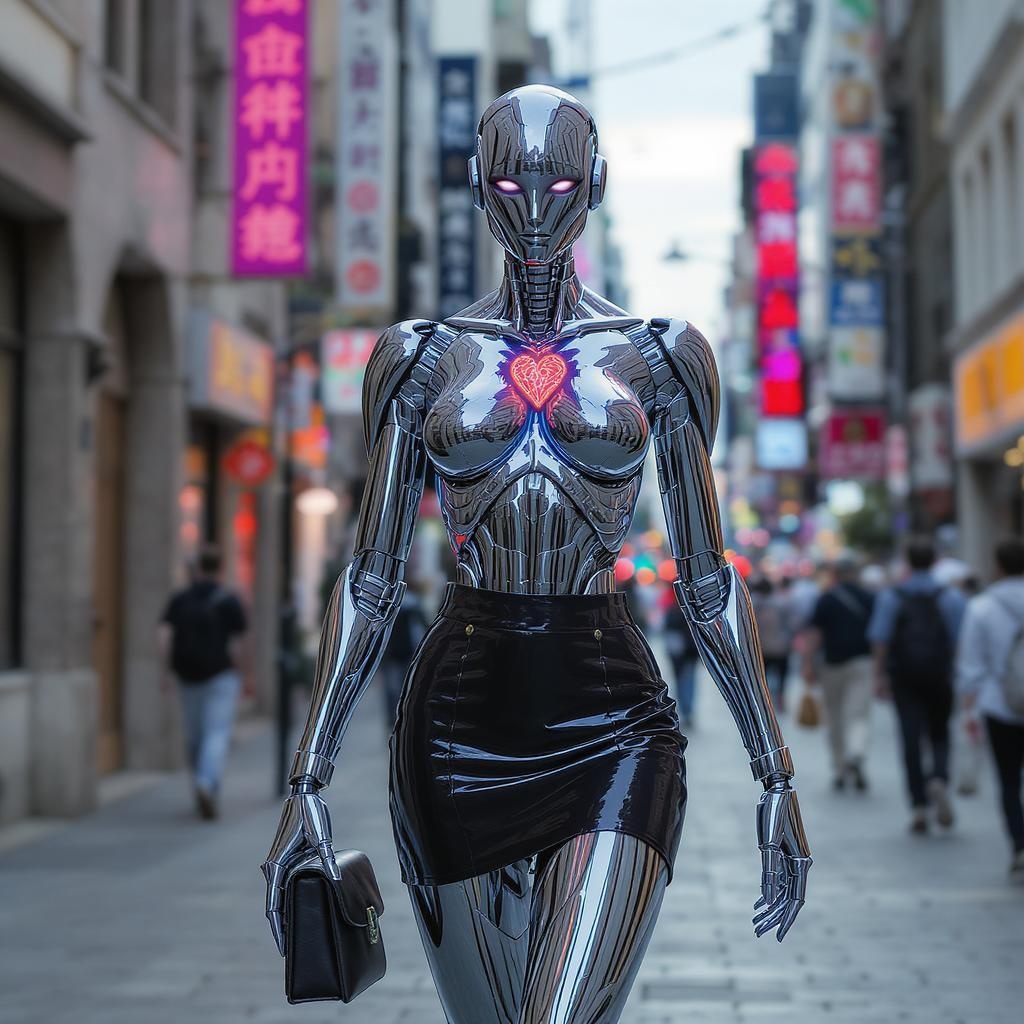 Atomic heart, futuristic robot, sleek cyborg, avant-garde android, featureless, polished chrome metal figure, stylish mini skirt, confidently strolling through urban streets, metropolitan backdrop, eyes meeting viewer, photographic portraiture, intricate skin textures, ultra-realistic render, 8k resolution, exquisitely detailed, full-length capture, high-definition full-spectrum color artistry, subtle adornments, soft diffused illumination, minimal depth of field, precise clarity, hyper-realistic style, cinema-worthy light play, intentionally corrupted, visible compression artifacts, aesthetic flaws, doubled elements, distorted visuals, anatomical anomalies, disproportionate features, unusual limbs, artistic imperfections, enigmatic silhouette.