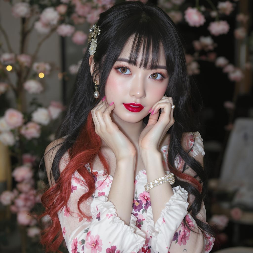 View this AI-generated image featuring a stunning attractive 32 year old kawaii girl with captivating features her silky graphite black hair transitions to a fiery flame red at the tips she dons a long floral print dress adorned with delicate ruffles complemented by elegant pearl drop earrings and a