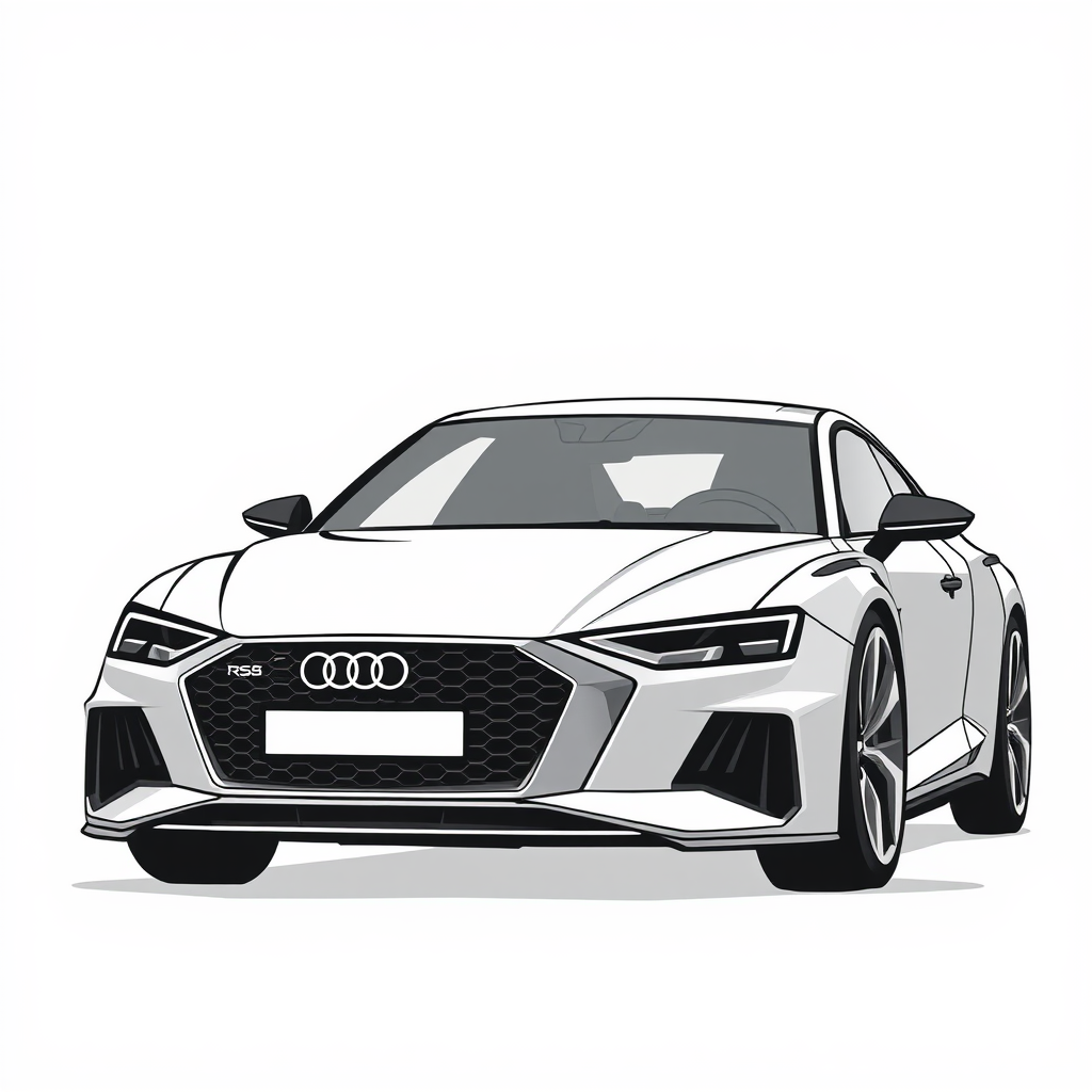 Audi RS8 concept minimalist illustration, traditional oil painting style, simplistic cartoon, larme kei aesthetic, simple line work, predominantly gray color palette, white background, subtle creative modifications to convey a unique yet recognizable interpretation.