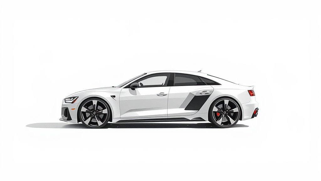 Audi RS8 concept minimalist illustration, white background, oil painting style, simplistic cartoon, larme kei influence, delicate line work, grayscale palette, subtle creative variations.