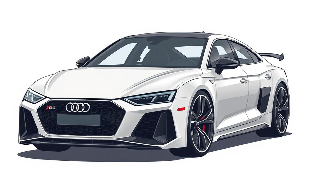 Audi RS8 concept minimalist illustration, white background, traditional oil painting style, simplistic cartoon elements, larme kei influence, clean and simple line work, predominantly gray color palette, subtle creative modifications maintaining core design essence.