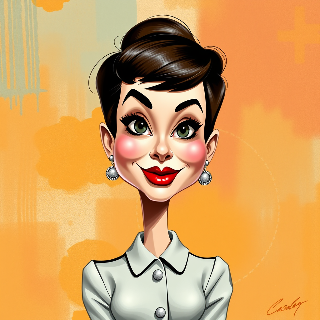 Audrey Hepburn-inspired caricature, embodying elegance with exaggerated features, wearing a stylish 1950s outfit with a playful, whimsical twist, featuring her iconic short hair and timeless grace, set against a vibrant, abstract background reminiscent of classic Hollywood glamour.