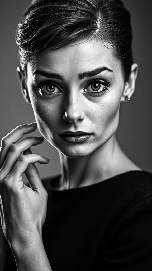 Audrey Hepburn's likeness reimagined in monochromatic grayscale, highly detailed, and hyper-realistic 8K resolution, capturing her iconic look in a photo-realistic, cinematic portrait, with a shallow depth of field and soft, diffused lighting, accentuating her piercing gaze that appears to directly engage the viewer. The image is remarkably detailed, revealing the finest details of her skin, with a texture that evokes a sense of realism. Her full-length frame is perfectly tailored, with each element carefully designed to reflect her glamorous and attractive persona from the 1950s movie era. However, the composition takes a sharp turn towards the macabre, portraying her with severely deformed, extra limbs, including arms and legs that are twisted and misplaced, a completely unnatural fusion of flesh and bone. Her face, once an epitome of beauty, is now grotesquely disfigured with features that diverge starkly from the norm, exhibiting telltale signs of a horrific mutation, including an eerie, elongated head and a mouth that appears frozen in a permanent scream. In a bizarre juxtaposition, her name is scribbled in the foreground in a crude, poorly drawn font, accompanied by a distressing watermark that consumes a significant portion of her body, transforming her into a dehydrated, fragile canvas, devoid of both health and dignity. This monstrosity is endowed with the appearance of living, pulsating, with faint, weak lines that suggest a leading-edge CGI design, showing signs of constant cloning and extractions, reflecting its morbid, fragmented descent into digital decay.