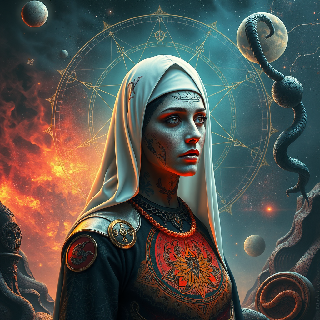 Aunt, sacred geometry, surreal futurism, Shamanic Tattoos, chaos, enigmatic nun, serpentine slime, 16k resolution, UHD, HDR, ethereal, abstract dreamscape, UnrealisticDream, vivid imagination.