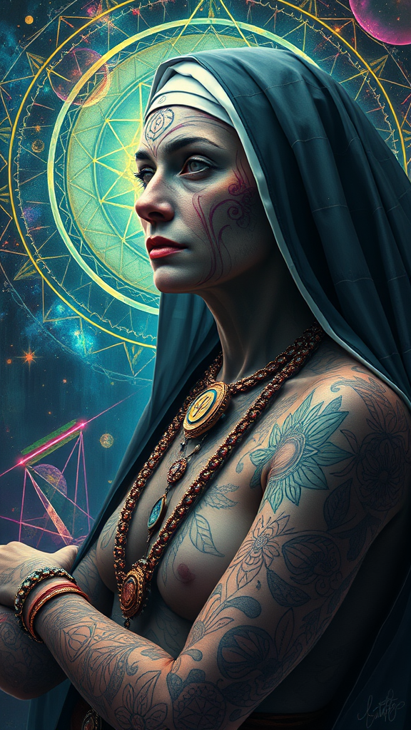 Aunt, sacred geometry, surreal futurism, Shamanic tattoos, chaos, spiritual nun, ethereal slime, 16k resolution, UHD, HDR, abstract dreamscape, artistic nudity, exploring the unreal, vibrant spectrum, intangible dimension, harmonious discord, transcendent reality.