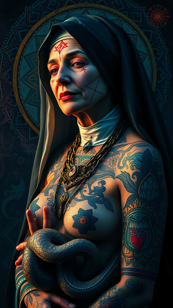Aunt, sacred geometry, surreal futurism, shamanic tattoos, chaos, mysterious nun, slithering slime, 16k resolution, UHD, HDR, ethereal, avant-garde, enigmatic nude, dreamlike yet uncanny, exploring the boundaries between reality and illusion, vibrant colors merging with dark shadows.