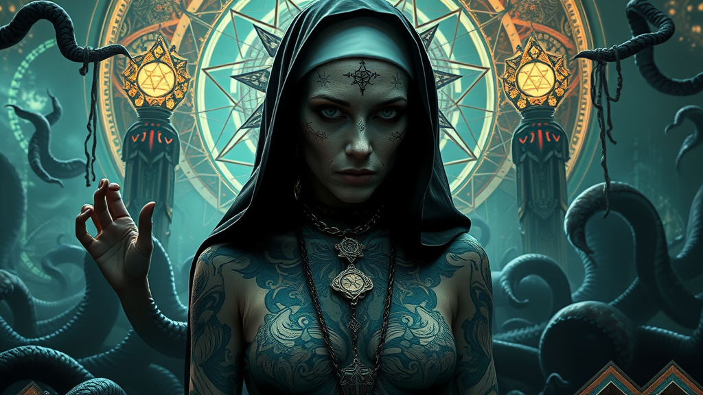 Aunt with shamanic tattoos, in a surreal futuristic world of sacred geometry, surrounded by chaos and slithering slime, resembling a mystical nun, captured in breathtaking detail at 16k resolution, UHD, HDR. The scene evokes a dreamlike, slightly provocative atmosphere with elements of unrealistic visions and distorted dreams.